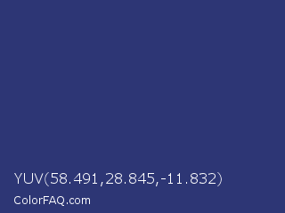 YUV 58.491,28.845,-11.832 Color is a normal blue color and the nearest color is Astronaut #283a77. Hex code #2d3675 and RGB value is rgb(45,54,117). In RGB color space, this color is composed of 18% red, 21% green, 46% blue, In CMYK color space, this color is composed of 62% cyan, 54% magenta, 0% yellow , 54% black , In HSL color space, this color has a hue angle of 233° , 44% saturation and 32% lightness.