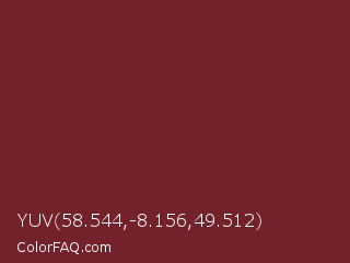 YUV 58.544,-8.156,49.512 Color is a dark red color and the nearest color is Crown Of Thorns #771f1f. Hex code #73212a and RGB value is rgb(115,33,42). In RGB color space, this color is composed of 45% red, 13% green, 16% blue, In CMYK color space, this color is composed of 0% cyan, 71% magenta, 63% yellow , 55% black , In HSL color space, this color has a hue angle of 353° , 55% saturation and 29% lightness.