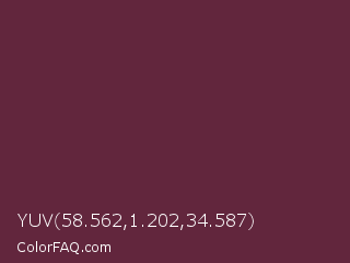 YUV 58.562,1.202,34.587 Color is a dark rose color and the nearest color is Tawny Port #692545. Hex code #62263d and RGB value is rgb(98,38,61). In RGB color space, this color is composed of 38% red, 15% green, 24% blue, In CMYK color space, this color is composed of 0% cyan, 61% magenta, 38% yellow , 62% black , In HSL color space, this color has a hue angle of 337° , 44% saturation and 27% lightness.