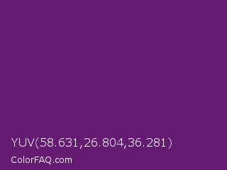 YUV 58.631,26.804,36.281 Color is a dark purple color and the nearest color is Midnight #702670. Hex code #641b71 and RGB value is rgb(100,27,113). In RGB color space, this color is composed of 39% red, 11% green, 44% blue, In CMYK color space, this color is composed of 12% cyan, 76% magenta, 0% yellow , 56% black , In HSL color space, this color has a hue angle of 291° , 61% saturation and 27% lightness.