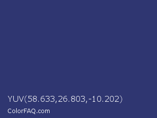 YUV 58.633,26.803,-10.202 Color is a normal blue color and the nearest color is Astronaut #283a77. Hex code #2f3671 and RGB value is rgb(47,54,113). In RGB color space, this color is composed of 18% red, 21% green, 44% blue, In CMYK color space, this color is composed of 58% cyan, 52% magenta, 0% yellow , 56% black , In HSL color space, this color has a hue angle of 234° , 41% saturation and 31% lightness.
