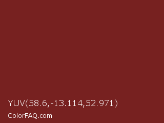 YUV 58.6,-13.114,52.971 Color is a dark red color and the nearest color is Crown Of Thorns #771f1f. Hex code #772120 and RGB value is rgb(119,33,32). In RGB color space, this color is composed of 47% red, 13% green, 13% blue, In CMYK color space, this color is composed of 0% cyan, 72% magenta, 73% yellow , 53% black , In HSL color space, this color has a hue angle of 1° , 58% saturation and 30% lightness.