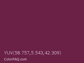 YUV 58.757,5.543,42.309 Color is a dark rose color and the nearest color is Tawny Port #692545. Hex code #6b2046 and RGB value is rgb(107,32,70). In RGB color space, this color is composed of 42% red, 13% green, 27% blue, In CMYK color space, this color is composed of 0% cyan, 70% magenta, 35% yellow , 58% black , In HSL color space, this color has a hue angle of 330° , 54% saturation and 27% lightness.