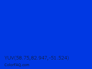 YUV 58.75,82.947,-51.524 Color is a normal blue color and the nearest color is Blue RYB #0247fe. Hex code #0038e3 and RGB value is rgb(0,56,227). In RGB color space, this color is composed of 0% red, 22% green, 89% blue, In CMYK color space, this color is composed of 100% cyan, 75% magenta, 0% yellow , 11% black , In HSL color space, this color has a hue angle of 225° , 100% saturation and 45% lightness.