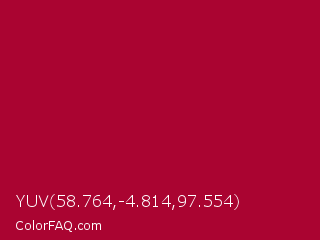 YUV 58.764,-4.814,97.554 Color is a normal rose color and the nearest color is Shiraz #b20931. Hex code #aa0431 and RGB value is rgb(170,4,49). In RGB color space, this color is composed of 67% red, 2% green, 19% blue, In CMYK color space, this color is composed of 0% cyan, 98% magenta, 71% yellow , 33% black , In HSL color space, this color has a hue angle of 344° , 95% saturation and 34% lightness.