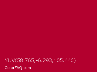 YUV 58.765,-6.293,105.446 Color is a normal red color and the nearest color is Alabama Crimson #af002a. Hex code #b3002e and RGB value is rgb(179,-0,46). In RGB color space, this color is composed of 70% red, 0% green, 18% blue, In CMYK color space, this color is composed of 0% cyan, 100% magenta, 74% yellow , 30% black , In HSL color space, this color has a hue angle of 345° , 100% saturation and 35% lightness.