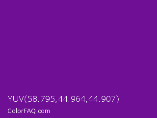 YUV 58.795,44.964,44.907 Color is a normal purple color and the nearest color is Purple #660099. Hex code #6e0f96 and RGB value is rgb(110,15,150). In RGB color space, this color is composed of 43% red, 6% green, 59% blue, In CMYK color space, this color is composed of 27% cyan, 90% magenta, 0% yellow , 41% black , In HSL color space, this color has a hue angle of 282° , 82% saturation and 32% lightness.