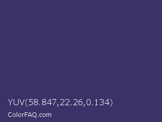 YUV 58.847,22.26,0.134 Color is a dark indigo color and the nearest color is Deep Koamaru #333366. Hex code #3b3268 and RGB value is rgb(59,50,104). In RGB color space, this color is composed of 23% red, 20% green, 41% blue, In CMYK color space, this color is composed of 43% cyan, 52% magenta, 0% yellow , 59% black , In HSL color space, this color has a hue angle of 250° , 35% saturation and 30% lightness.