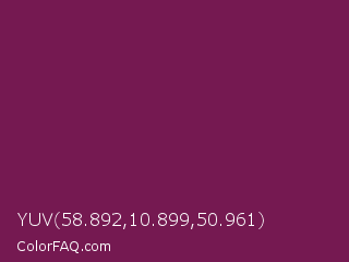 YUV 58.892,10.899,50.961 Color is a dark magenta color and the nearest color is Pansy Purple #78184a. Hex code #751951 and RGB value is rgb(117,25,81). In RGB color space, this color is composed of 46% red, 10% green, 32% blue, In CMYK color space, this color is composed of 0% cyan, 79% magenta, 31% yellow , 54% black , In HSL color space, this color has a hue angle of 323° , 65% saturation and 28% lightness.