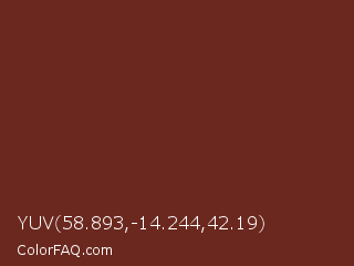 YUV 58.893,-14.244,42.19 Color is a dark red color and the nearest color is Liver Organ #6c2e1f. Hex code #6b281e and RGB value is rgb(107,40,30). In RGB color space, this color is composed of 42% red, 16% green, 12% blue, In CMYK color space, this color is composed of 0% cyan, 63% magenta, 72% yellow , 58% black , In HSL color space, this color has a hue angle of 8° , 56% saturation and 27% lightness.