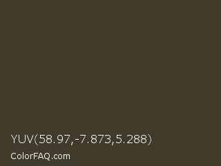 YUV 58.97,-7.873,5.288 Color is a very dark orange color and the nearest color is Taupe #483c32. Hex code #413b2b and RGB value is rgb(65,59,43). In RGB color space, this color is composed of 25% red, 23% green, 17% blue, In CMYK color space, this color is composed of 0% cyan, 9% magenta, 34% yellow , 75% black , In HSL color space, this color has a hue angle of 44° , 20% saturation and 21% lightness.
