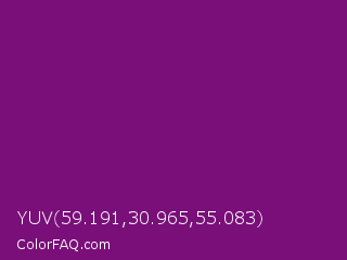 YUV 59.191,30.965,55.083 Color is a dark magenta color and the nearest color is Patriarch #800080. Hex code #7a0f7a and RGB value is rgb(122,15,122). In RGB color space, this color is composed of 48% red, 6% green, 48% blue, In CMYK color space, this color is composed of 0% cyan, 88% magenta, 0% yellow , 52% black , In HSL color space, this color has a hue angle of 300° , 78% saturation and 27% lightness.