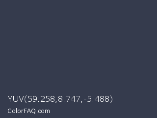 YUV 59.258,8.747,-5.488 Color is a dark blue color and the nearest color is Bright Gray #3c4151. Hex code #353b4d and RGB value is rgb(53,59,77). In RGB color space, this color is composed of 21% red, 23% green, 30% blue, In CMYK color space, this color is composed of 31% cyan, 23% magenta, 0% yellow , 70% black , In HSL color space, this color has a hue angle of 225° , 18% saturation and 25% lightness.
