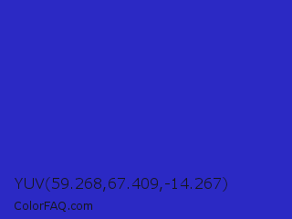 YUV 59.268,67.409,-14.267 Color is a normal indigo color and the nearest color is Persian Blue #1c39bb. Hex code #2b29c4 and RGB value is rgb(43,41,196). In RGB color space, this color is composed of 17% red, 16% green, 77% blue, In CMYK color space, this color is composed of 78% cyan, 79% magenta, 0% yellow , 23% black , In HSL color space, this color has a hue angle of 241° , 65% saturation and 46% lightness.