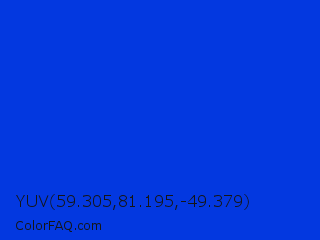 YUV 59.305,81.195,-49.379 Color is a normal blue color and the nearest color is Blue RYB #0247fe. Hex code #0338e0 and RGB value is rgb(3,56,224). In RGB color space, this color is composed of 1% red, 22% green, 88% blue, In CMYK color space, this color is composed of 99% cyan, 75% magenta, 0% yellow , 12% black , In HSL color space, this color has a hue angle of 226° , 97% saturation and 45% lightness.