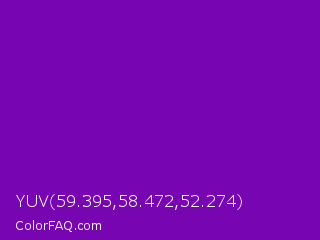 YUV 59.395,58.472,52.274 Color is a normal purple color and the nearest color is Violet RYB #8601af. Hex code #7706b2 and RGB value is rgb(119,6,178). In RGB color space, this color is composed of 47% red, 2% green, 70% blue, In CMYK color space, this color is composed of 33% cyan, 97% magenta, 0% yellow , 30% black , In HSL color space, this color has a hue angle of 279° , 93% saturation and 36% lightness.