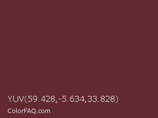 YUV 59.428,-5.634,33.828 Color is a dark red color and the nearest color is Buccaneer #622f30. Hex code #622a30 and RGB value is rgb(98,42,48). In RGB color space, this color is composed of 38% red, 16% green, 19% blue, In CMYK color space, this color is composed of 0% cyan, 57% magenta, 51% yellow , 62% black , In HSL color space, this color has a hue angle of 354° , 40% saturation and 27% lightness.