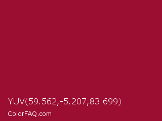 YUV 59.562,-5.207,83.699 Color is a normal red color and the nearest color is Pink Raspberry #980036. Hex code #9b0d31 and RGB value is rgb(155,13,49). In RGB color space, this color is composed of 61% red, 5% green, 19% blue, In CMYK color space, this color is composed of 0% cyan, 92% magenta, 68% yellow , 39% black , In HSL color space, this color has a hue angle of 345° , 85% saturation and 33% lightness.