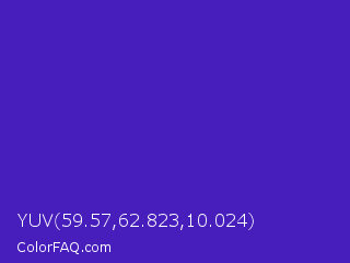 YUV 59.57,62.823,10.024 Color is a normal indigo color and the nearest color is Interdimensional Blue #360ccc. Hex code #471dbb and RGB value is rgb(71,29,187). In RGB color space, this color is composed of 28% red, 11% green, 73% blue, In CMYK color space, this color is composed of 62% cyan, 84% magenta, 0% yellow , 27% black , In HSL color space, this color has a hue angle of 256° , 73% saturation and 42% lightness.