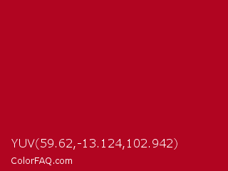 YUV 59.62,-13.124,102.942 Color is a normal red color and the nearest color is Alabama Crimson #af002a. Hex code #b10521 and RGB value is rgb(177,5,33). In RGB color space, this color is composed of 69% red, 2% green, 13% blue, In CMYK color space, this color is composed of 0% cyan, 97% magenta, 81% yellow , 31% black , In HSL color space, this color has a hue angle of 350° , 95% saturation and 36% lightness.
