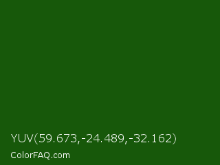 YUV 59.673,-24.489,-32.162 Color is a very dark green color and the nearest color is Lincoln Green #195905. Hex code #17580a and RGB value is rgb(23,88,10). In RGB color space, this color is composed of 9% red, 35% green, 4% blue, In CMYK color space, this color is composed of 74% cyan, 0% magenta, 89% yellow , 65% black , In HSL color space, this color has a hue angle of 110° , 80% saturation and 19% lightness.