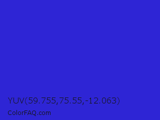 YUV 59.755,75.55,-12.063 Color is a normal indigo color and the nearest color is Palatinate Blue #273be2. Hex code #2e25d5 and RGB value is rgb(46,37,213). In RGB color space, this color is composed of 18% red, 15% green, 84% blue, In CMYK color space, this color is composed of 78% cyan, 83% magenta, 0% yellow , 16% black , In HSL color space, this color has a hue angle of 243° , 70% saturation and 49% lightness.