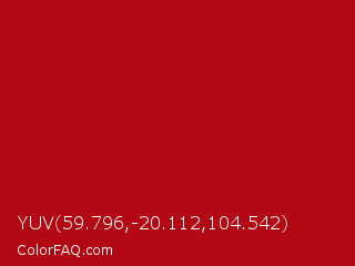 YUV 59.796,-20.112,104.542 Color is a normal red color and the nearest color is International Orange Engineering #ba160c. Hex code #b30713 and RGB value is rgb(179,7,19). In RGB color space, this color is composed of 70% red, 3% green, 7% blue, In CMYK color space, this color is composed of 0% cyan, 96% magenta, 89% yellow , 30% black , In HSL color space, this color has a hue angle of 356° , 92% saturation and 36% lightness.