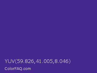 YUV 59.826,41.005,8.046 Color is a normal indigo color and the nearest color is KSU Purple #512888. Hex code #45278f and RGB value is rgb(69,39,143). In RGB color space, this color is composed of 27% red, 15% green, 56% blue, In CMYK color space, this color is composed of 52% cyan, 73% magenta, 0% yellow , 44% black , In HSL color space, this color has a hue angle of 257° , 57% saturation and 36% lightness.