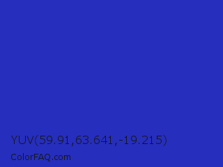 YUV 59.91,63.641,-19.215 Color is a normal blue color and the nearest color is Persian Blue #1c39bb. Hex code #262ebd and RGB value is rgb(38,46,189). In RGB color space, this color is composed of 15% red, 18% green, 74% blue, In CMYK color space, this color is composed of 80% cyan, 76% magenta, 0% yellow , 26% black , In HSL color space, this color has a hue angle of 237° , 67% saturation and 45% lightness.