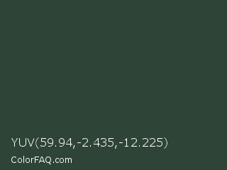YUV 59.94,-2.435,-12.225 Color is a very dark green color and the nearest color is Kombu Green #354230. Hex code #2e4437 and RGB value is rgb(46,68,55). In RGB color space, this color is composed of 18% red, 27% green, 22% blue, In CMYK color space, this color is composed of 32% cyan, 0% magenta, 19% yellow , 73% black , In HSL color space, this color has a hue angle of 145° , 19% saturation and 22% lightness.