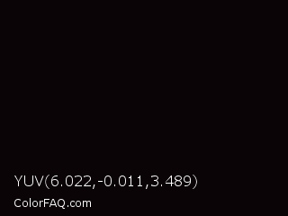 YUV 6.022,-0.011,3.489 Color is a almost black rose color and the nearest color is Cod Gray #0b0b0b. Hex code #0a0406 and RGB value is rgb(10,4,6). In RGB color space, this color is composed of 4% red, 2% green, 2% blue, In CMYK color space, this color is composed of 0% cyan, 60% magenta, 40% yellow , 96% black , In HSL color space, this color has a hue angle of 340° , 43% saturation and 3% lightness.