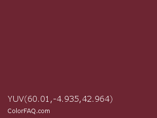 YUV 60.01,-4.935,42.964 Color is a dark red color and the nearest color is Wine #722f37. Hex code #6d2532 and RGB value is rgb(109,37,50). In RGB color space, this color is composed of 43% red, 15% green, 20% blue, In CMYK color space, this color is composed of 0% cyan, 66% magenta, 54% yellow , 57% black , In HSL color space, this color has a hue angle of 349° , 49% saturation and 29% lightness.