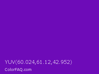 YUV 60.024,61.12,42.952 Color is a normal purple color and the nearest color is Violet RYB #8601af. Hex code #6d0bb8 and RGB value is rgb(109,11,184). In RGB color space, this color is composed of 43% red, 4% green, 72% blue, In CMYK color space, this color is composed of 41% cyan, 94% magenta, 0% yellow , 28% black , In HSL color space, this color has a hue angle of 274° , 89% saturation and 38% lightness.