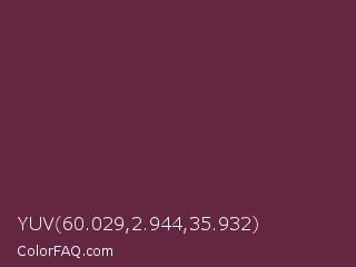 YUV 60.029,2.944,35.932 Color is a dark rose color and the nearest color is Tawny Port #692545. Hex code #652642 and RGB value is rgb(101,38,66). In RGB color space, this color is composed of 40% red, 15% green, 26% blue, In CMYK color space, this color is composed of 0% cyan, 62% magenta, 35% yellow , 60% black , In HSL color space, this color has a hue angle of 333° , 45% saturation and 27% lightness.
