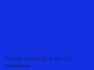 YUV 60.034,82.314,-35.11 Color is a normal blue color and the nearest color is Palatinate Blue #273be2. Hex code #1430e3 and RGB value is rgb(20,48,227). In RGB color space, this color is composed of 8% red, 19% green, 89% blue, In CMYK color space, this color is composed of 91% cyan, 79% magenta, 0% yellow , 11% black , In HSL color space, this color has a hue angle of 232° , 84% saturation and 48% lightness.