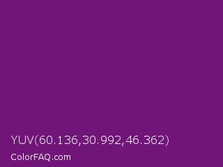 YUV 60.136,30.992,46.362 Color is a dark magenta color and the nearest color is Midnight #702670. Hex code #71157b and RGB value is rgb(113,21,123). In RGB color space, this color is composed of 44% red, 8% green, 48% blue, In CMYK color space, this color is composed of 8% cyan, 83% magenta, 0% yellow , 52% black , In HSL color space, this color has a hue angle of 294° , 71% saturation and 28% lightness.