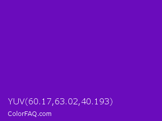 YUV 60.17,63.02,40.193 Color is a normal purple color and the nearest color is Violet RYB #8601af. Hex code #6a0cbc and RGB value is rgb(106,12,188). In RGB color space, this color is composed of 42% red, 5% green, 74% blue, In CMYK color space, this color is composed of 44% cyan, 94% magenta, 0% yellow , 26% black , In HSL color space, this color has a hue angle of 272° , 88% saturation and 39% lightness.