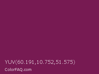 YUV 60.191,10.752,51.575 Color is a dark magenta color and the nearest color is Pansy Purple #78184a. Hex code #771a52 and RGB value is rgb(119,26,82). In RGB color space, this color is composed of 47% red, 10% green, 32% blue, In CMYK color space, this color is composed of 0% cyan, 78% magenta, 31% yellow , 53% black , In HSL color space, this color has a hue angle of 324° , 64% saturation and 28% lightness.