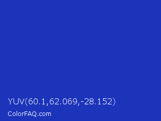 YUV 60.1,62.069,-28.152 Color is a normal blue color and the nearest color is Persian Blue #1c39bb. Hex code #1c34ba and RGB value is rgb(28,52,186). In RGB color space, this color is composed of 11% red, 20% green, 73% blue, In CMYK color space, this color is composed of 85% cyan, 72% magenta, 0% yellow , 27% black , In HSL color space, this color has a hue angle of 231° , 74% saturation and 42% lightness.