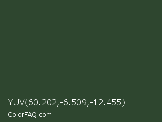 YUV 60.202,-6.509,-12.455 Color is a dark green color and the nearest color is Kombu Green #354230. Hex code #2e462f and RGB value is rgb(46,70,47). In RGB color space, this color is composed of 18% red, 27% green, 18% blue, In CMYK color space, this color is composed of 34% cyan, 0% magenta, 33% yellow , 73% black , In HSL color space, this color has a hue angle of 123° , 21% saturation and 23% lightness.