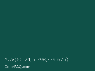 YUV 60.24,5.798,-39.675 Color is a very dark cyan color and the nearest color is Eden #105852. Hex code #0f5148 and RGB value is rgb(15,81,72). In RGB color space, this color is composed of 6% red, 32% green, 28% blue, In CMYK color space, this color is composed of 81% cyan, 0% magenta, 11% yellow , 68% black , In HSL color space, this color has a hue angle of 172° , 69% saturation and 19% lightness.