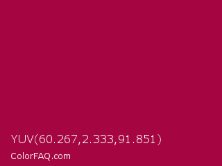 YUV 60.267,2.333,91.851 Color is a normal rose color and the nearest color is Pink Raspberry #980036. Hex code #a50641 and RGB value is rgb(165,6,65). In RGB color space, this color is composed of 65% red, 2% green, 25% blue, In CMYK color space, this color is composed of 0% cyan, 96% magenta, 61% yellow , 35% black , In HSL color space, this color has a hue angle of 338° , 93% saturation and 34% lightness.
