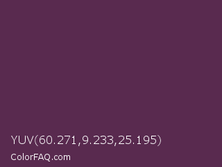 YUV 60.271,9.233,25.195 Color is a dark magenta color and the nearest color is Japanese Violet #5b3256. Hex code #592a4f and RGB value is rgb(89,42,79). In RGB color space, this color is composed of 35% red, 16% green, 31% blue, In CMYK color space, this color is composed of 0% cyan, 53% magenta, 11% yellow , 65% black , In HSL color space, this color has a hue angle of 313° , 36% saturation and 26% lightness.