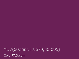 YUV 60.282,12.679,40.095 Color is a dark magenta color and the nearest color is Palatinate Purple #682860. Hex code #6a2056 and RGB value is rgb(106,32,86). In RGB color space, this color is composed of 42% red, 13% green, 34% blue, In CMYK color space, this color is composed of 0% cyan, 70% magenta, 19% yellow , 58% black , In HSL color space, this color has a hue angle of 316° , 54% saturation and 27% lightness.