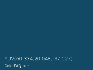YUV 60.334,20.048,-37.127 Color is a dark blue color and the nearest color is Teal Blue #044259. Hex code #124a65 and RGB value is rgb(18,74,101). In RGB color space, this color is composed of 7% red, 29% green, 40% blue, In CMYK color space, this color is composed of 82% cyan, 27% magenta, 0% yellow , 60% black , In HSL color space, this color has a hue angle of 200° , 70% saturation and 23% lightness.
