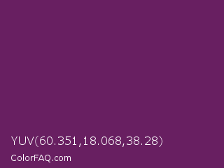 YUV 60.351,18.068,38.28 Color is a dark magenta color and the nearest color is Palatinate Purple #682860. Hex code #681f61 and RGB value is rgb(104,31,97). In RGB color space, this color is composed of 41% red, 12% green, 38% blue, In CMYK color space, this color is composed of 0% cyan, 70% magenta, 7% yellow , 59% black , In HSL color space, this color has a hue angle of 306° , 54% saturation and 26% lightness.