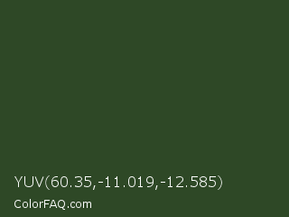 YUV 60.35,-11.019,-12.585 Color is a very dark green color and the nearest color is Kombu Green #354230. Hex code #2e4826 and RGB value is rgb(46,72,38). In RGB color space, this color is composed of 18% red, 28% green, 15% blue, In CMYK color space, this color is composed of 36% cyan, 0% magenta, 47% yellow , 72% black , In HSL color space, this color has a hue angle of 106° , 31% saturation and 22% lightness.