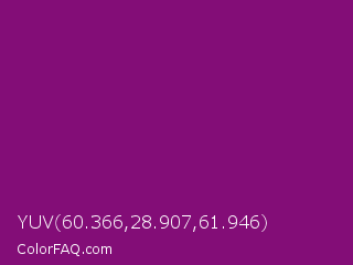 YUV 60.366,28.907,61.946 Color is a dark magenta color and the nearest color is Patriarch #800080. Hex code #830d77 and RGB value is rgb(131,13,119). In RGB color space, this color is composed of 51% red, 5% green, 47% blue, In CMYK color space, this color is composed of 0% cyan, 90% magenta, 9% yellow , 49% black , In HSL color space, this color has a hue angle of 306° , 82% saturation and 28% lightness.