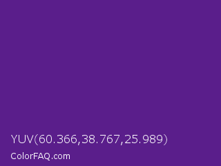 YUV 60.366,38.767,25.989 Color is a normal purple color and the nearest color is KSU Purple #512888. Hex code #5a1e8b and RGB value is rgb(90,30,139). In RGB color space, this color is composed of 35% red, 12% green, 55% blue, In CMYK color space, this color is composed of 35% cyan, 78% magenta, 0% yellow , 45% black , In HSL color space, this color has a hue angle of 273° , 64% saturation and 33% lightness.