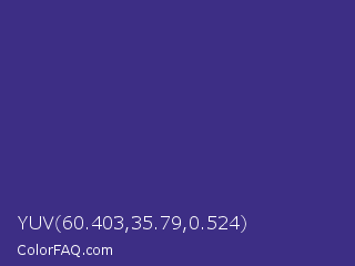 YUV 60.403,35.79,0.524 Color is a normal indigo color and the nearest color is Minsk #3f307f. Hex code #3d2e85 and RGB value is rgb(61,46,133). In RGB color space, this color is composed of 24% red, 18% green, 52% blue, In CMYK color space, this color is composed of 54% cyan, 65% magenta, 0% yellow , 48% black , In HSL color space, this color has a hue angle of 250° , 49% saturation and 35% lightness.